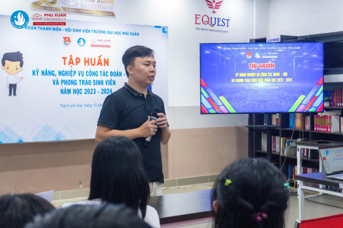 Trong chương trình workshop kỹ năng Đoàn Hội lần này, lãnh đạo phong trào sinh viên trường đã giới thiệu rõ hơn về hai tổ chức, cũng như công tác xây dựng phong trào “Sinh viên 5 tốt” và kế hoạch năm học 2023 – 2024 của trường Đại học Phú Xuân.